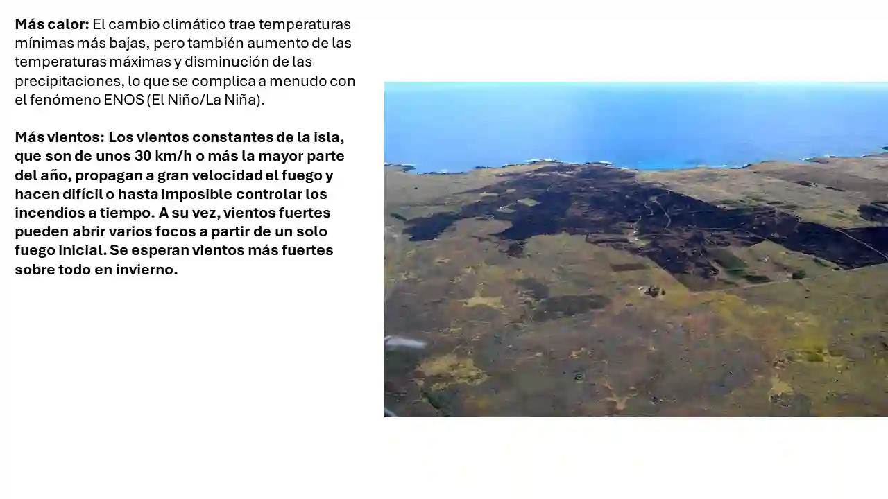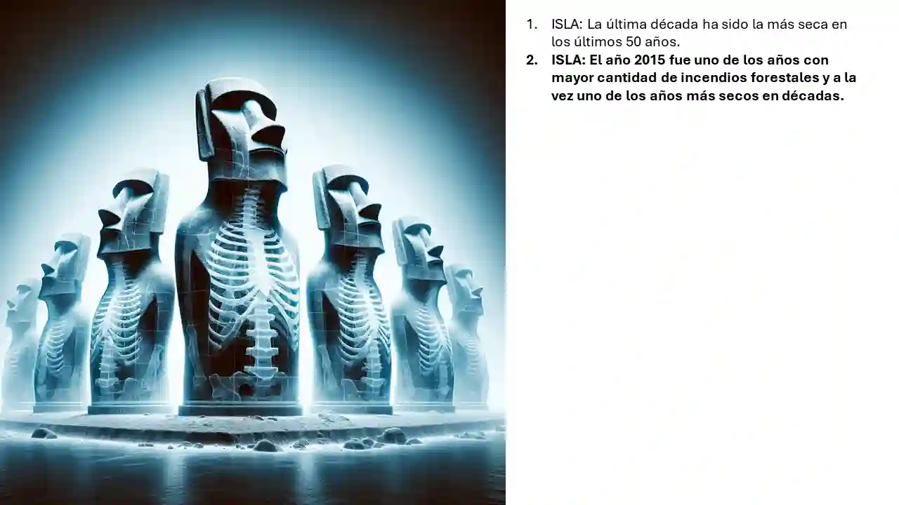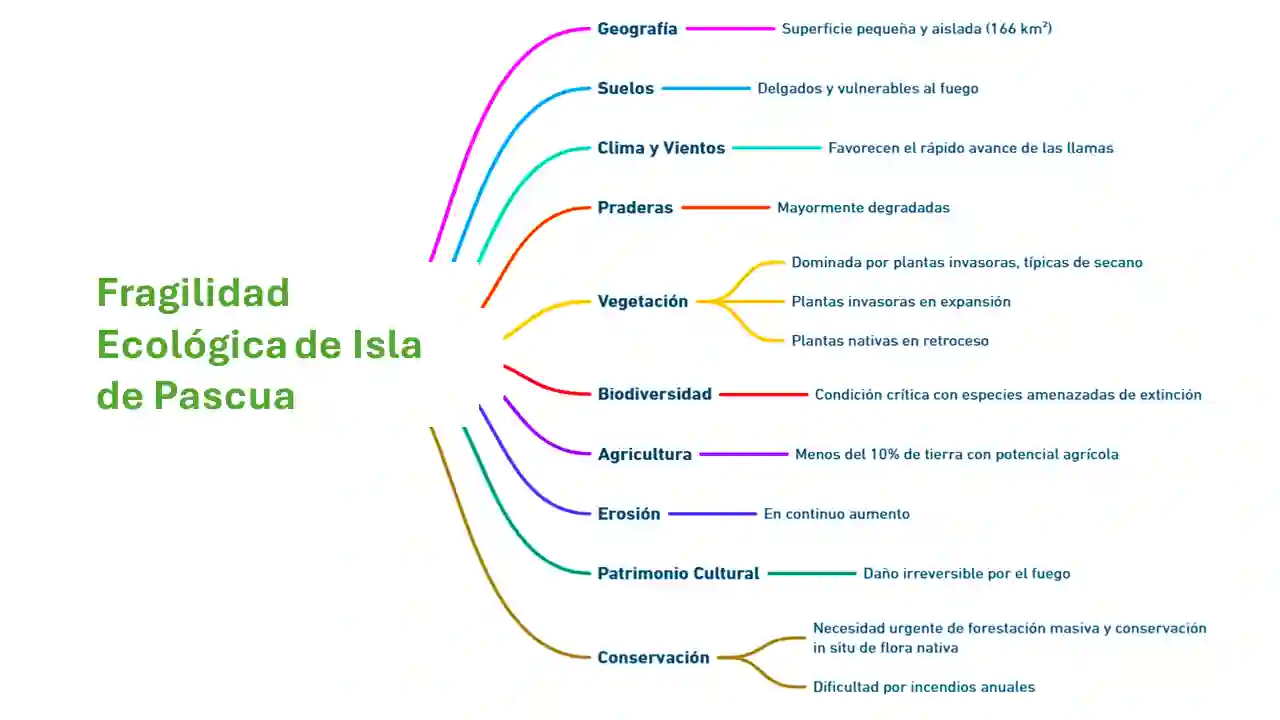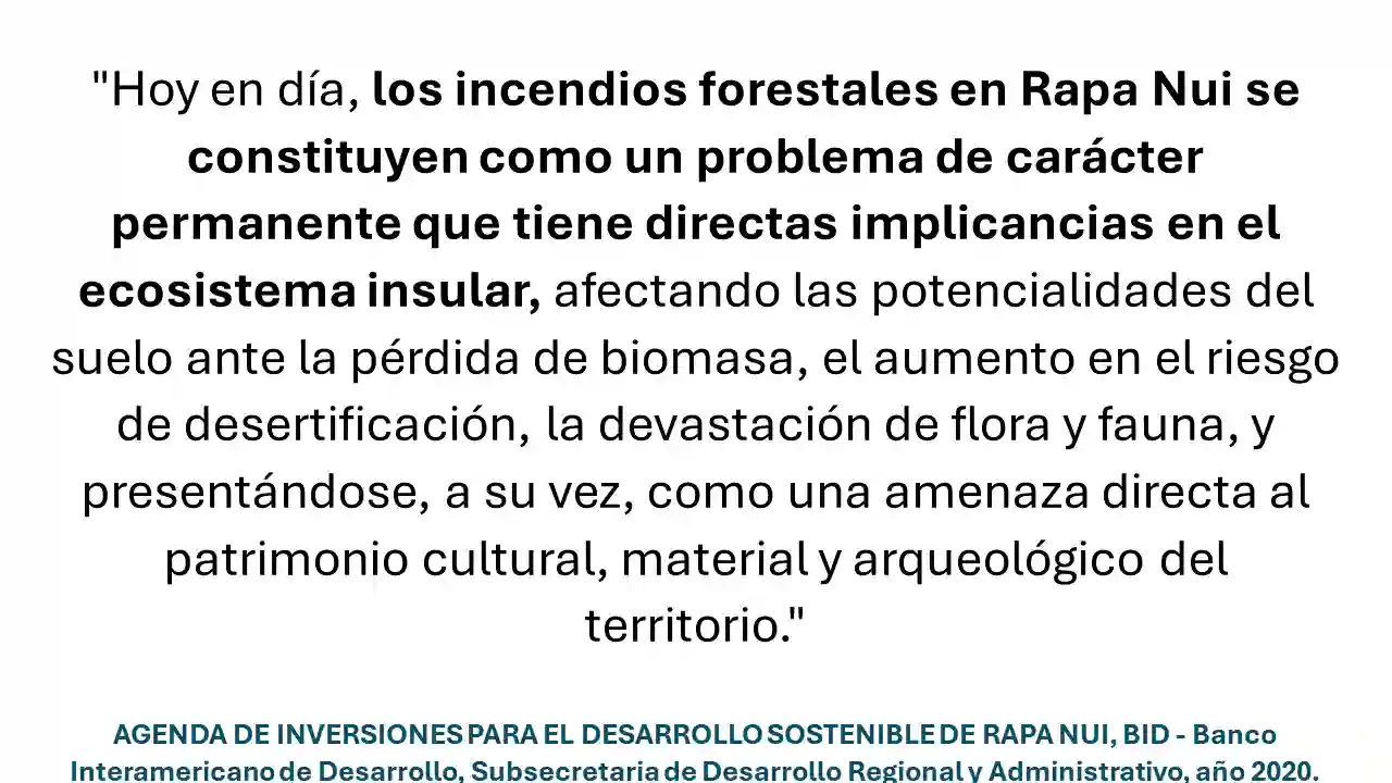 - Impacto en el Ecosistema y la Comunidad: Se describieron los efectos devastadores de los incendios en la biodiversidad, los suelos, la agricultura y el patrimonio cultural de Rapa Nui. Se enfatizó la necesidad de restaurar la flora nativa y mejorar la gestión del suelo.