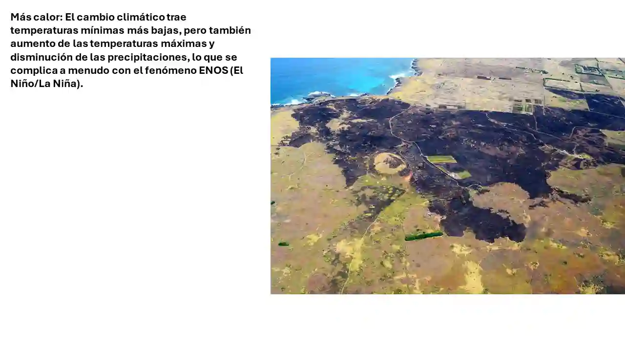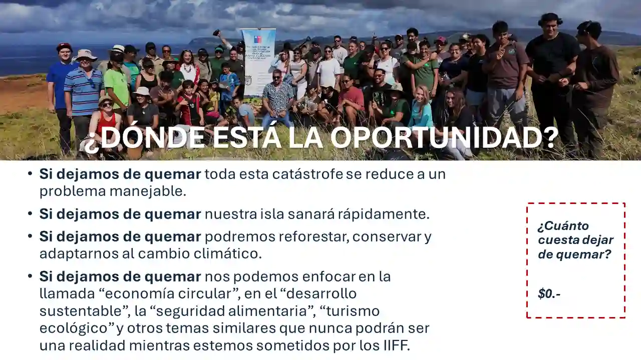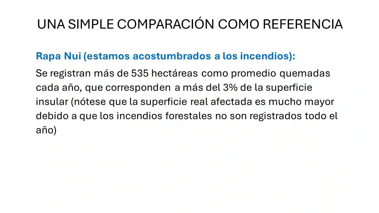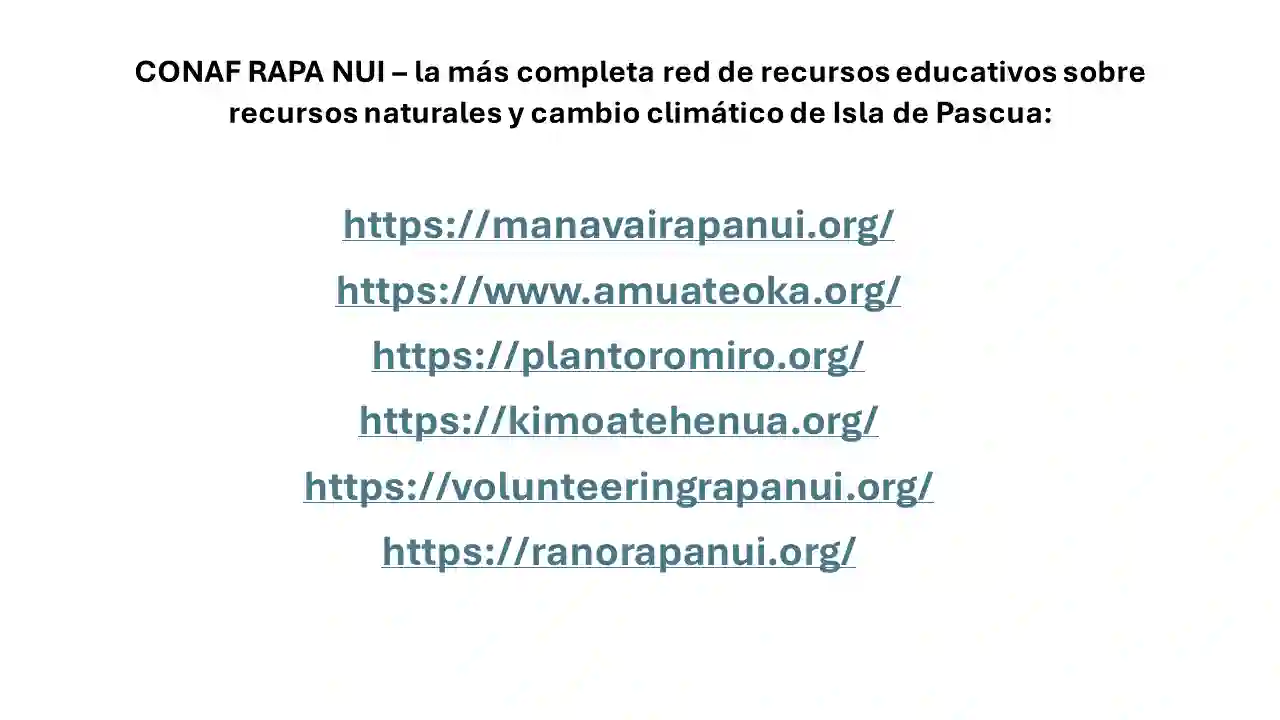 - Impacto en el Ecosistema y la Comunidad: Se describieron los efectos devastadores de los incendios en la biodiversidad, los suelos, la agricultura y el patrimonio cultural de Rapa Nui. Se enfatizó la necesidad de restaurar la flora nativa y mejorar la gestión del suelo.