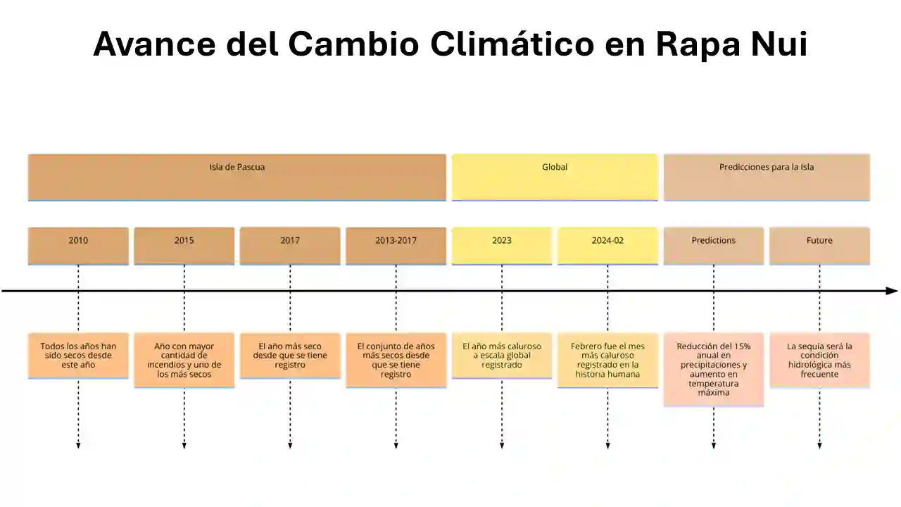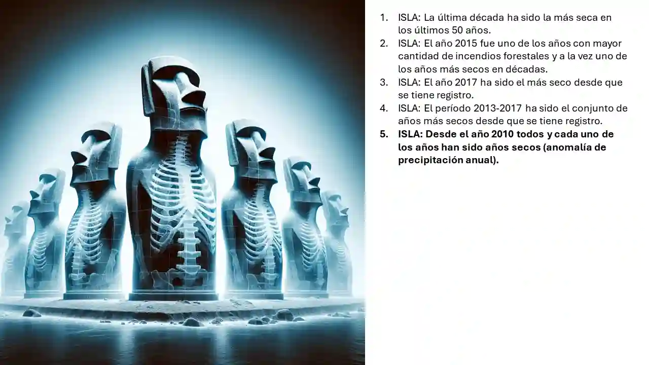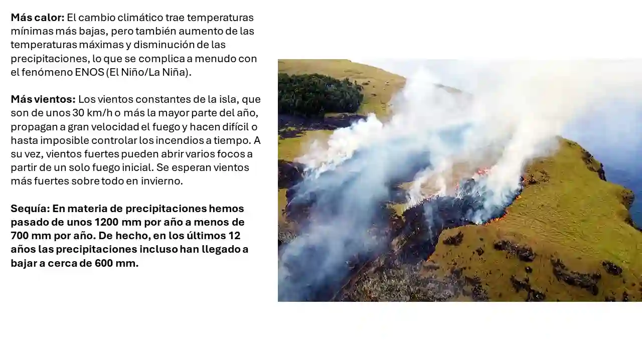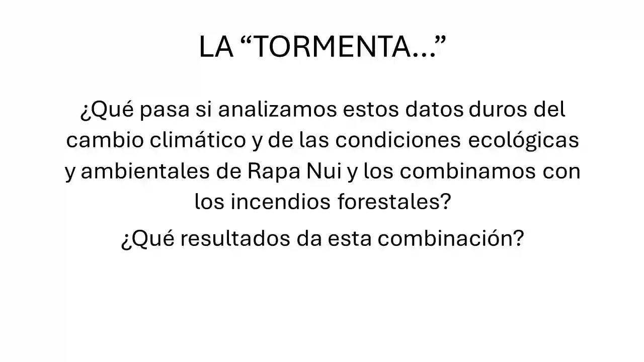 A continuación, la antropóloga de CONAF presentó datos relevantes sobre el cambio climático y su impacto en los incendios forestales en Isla de Pascua. Ella destacó que los últimos 10 años han sido los más secos de los últimos 50, con una disminución significativa en las precipitaciones y un aumento en la frecuencia e intensidad de los incendios. La presentación incluyó estadísticas alarmantes sobre la sequía y el aumento de las temperaturas globales, subrayando la urgencia de tomar medidas.