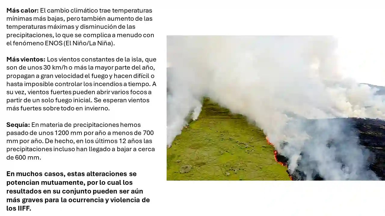 El experto en incendios forestales y jefe BRIPA, ofreció una visión detallada de la situación actual en la isla. Destacó que casi todos los incendios son provocados intencionalmente y que los efectos del cambio climático están exacerbando su frecuencia e intensidad. También llamó a la acción inmediata para evitar que los incendios continúen devastando la isla y afectando tanto su medio ambiente como su productividad.