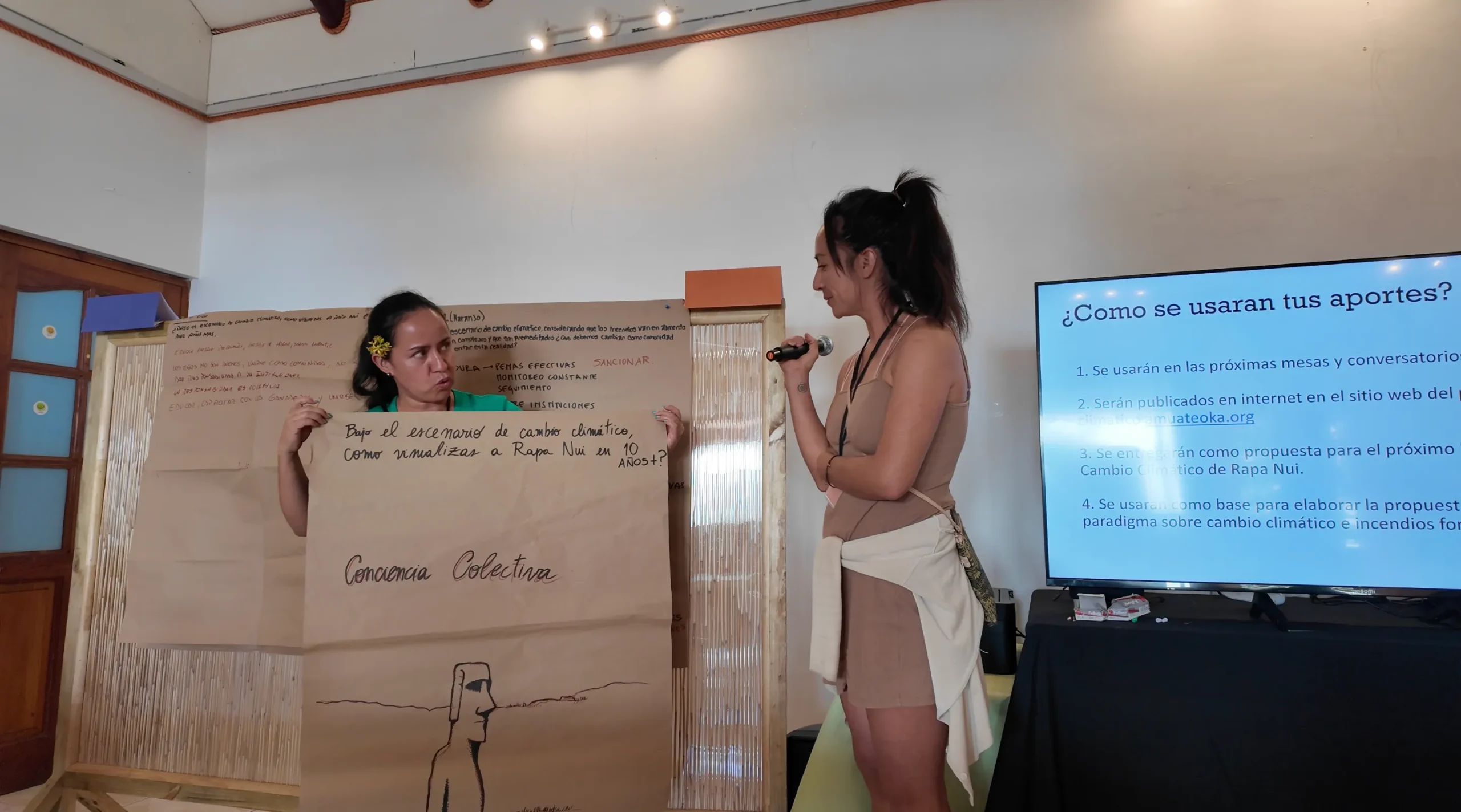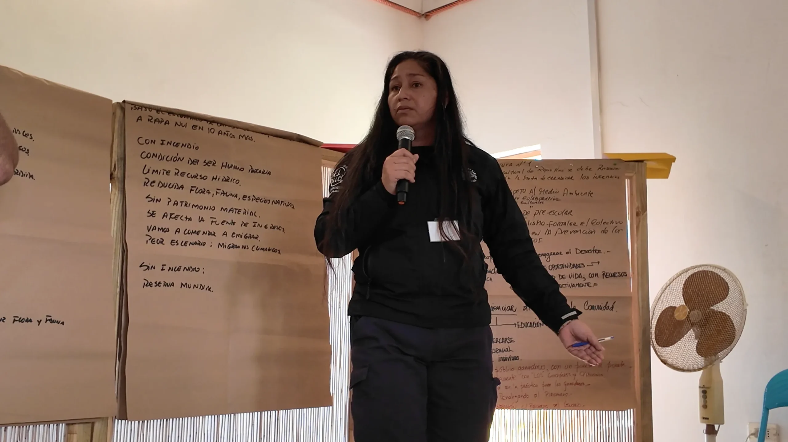 Después de las exposiciones, la encargada de la mesa cerró la ronda de presentaciones, subrayando la oportunidad que tiene la comunidad de Rapa Nui para controlar y eventualmente erradicar los incendios forestales. Explicó que la mayoría de los incendios son evitables y que con un esfuerzo conjunto, la isla puede adaptarse mejor al cambio climático y enfocarse en un desarrollo sostenible. La isla debe ponerse la meta de erradicar los incendios forestales.