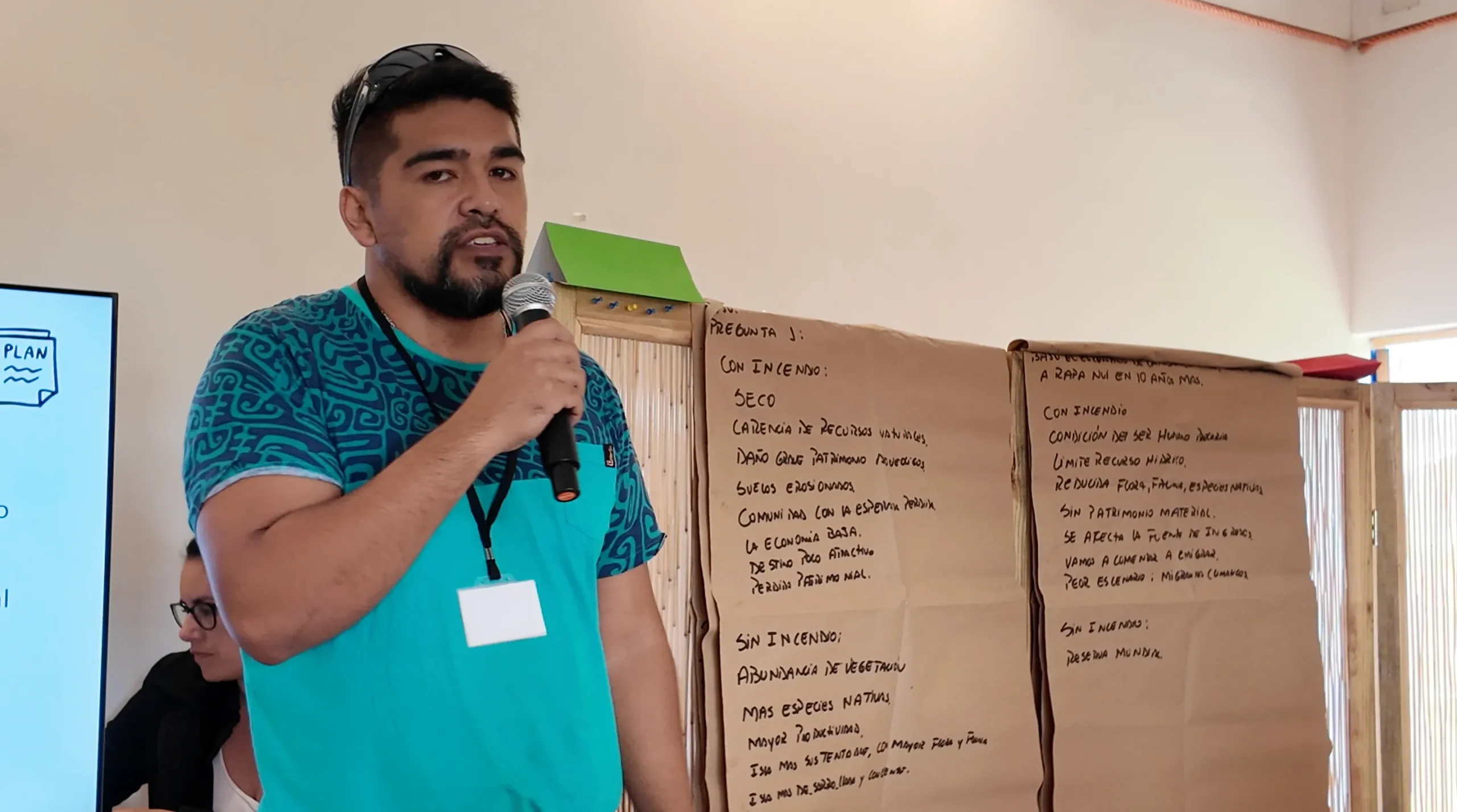 El equipo de CONAF Rapa Nui discutió durante varios días el tema “Cambio Climático e Incendios Forestales en Rapa Nui: la urgente necesidad de un nuevo paradigma” y conforme a la metodología seleccionada elaboró una serie de preguntas para gatillar la discusión en la mesa sectorial. Finalmente se eligieron las 5 preguntas que se consideraron más oportunas y relevantes para la dinámica, que son las siguientes: