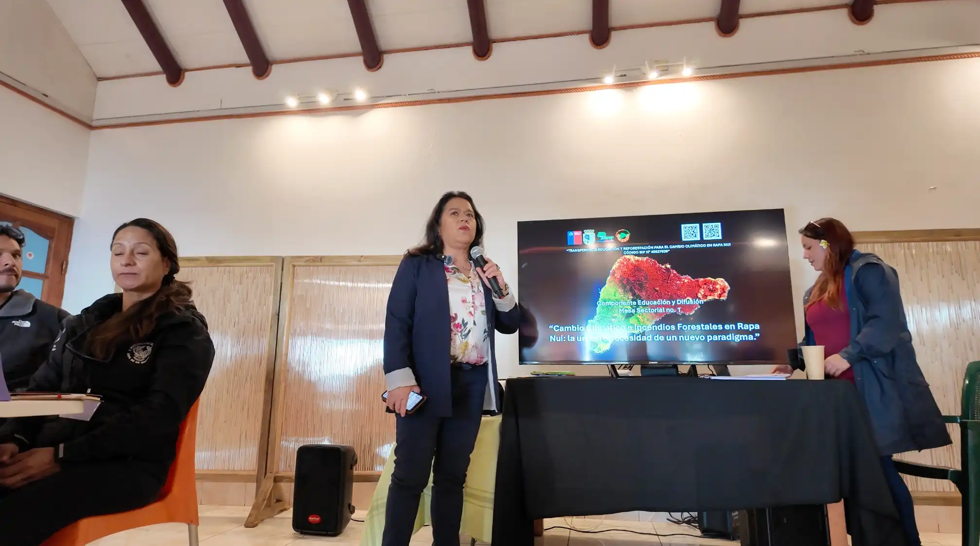 Todas las presentaciones fueron realizadas por el equipo de CONAF Rapa Nui. La mesa comenzó con una bienvenida formal de la jefa provincial de la institución, quien agradeció a los asistentes por su puntualidad y compromiso y dio inicio a las mesas y conversatorios del programa de cambio climático. Se resaltó la importancia del encuentro y se subrayó la necesidad de reflexionar sobre cómo el cambio climático está afectando a la isla y cómo la comunidad puede tomar medidas para reducir estos impactos, especialmente en relación con los incendios forestales.