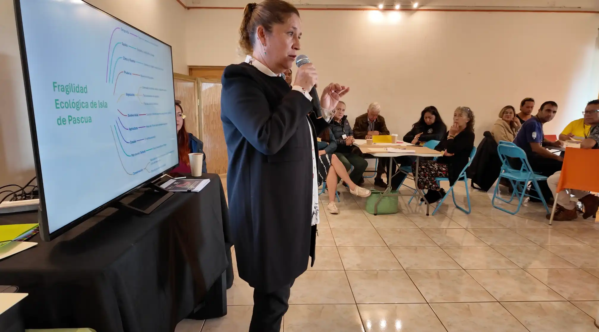 La guardaparque especialista en recursos naturales continuó la discusión enfocándose en la fragilidad del ecosistema de Rapa Nui. Hizo hincapié en la vulnerabilidad de los suelos y la vegetación nativa, afectada tanto por la erosión como por los incendios. Mencionó la expansión de plantas invasoras y el deterioro de la biodiversidad local, así como el daño al patrimonio cultural de la isla debido a los incendios. Mostró datos duros alarmantes e incluso críticos con respecto a la condición de los recursos naturales y la biodiversidad de la isla.
