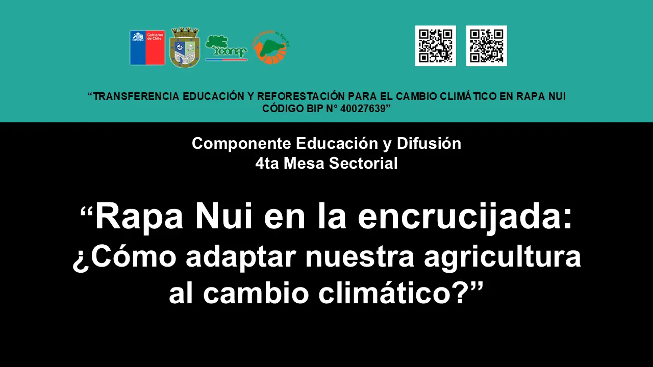 Esta 4ta Mesa Sectorial, llamada “Rapa Nui en la encrucijada: ¿Cómo adaptar nuestra agricultura al cambio climático?” tuvo como objetivo general analizar de manera participativa los impactos del cambio climático en la agricultura de Rapa Nui y proponer y discutir estrategias adaptativas para enfrentar estos desafíos. El taller se realizó en el salón de Ma’u Henua, ubicado en Mataveri Otai.