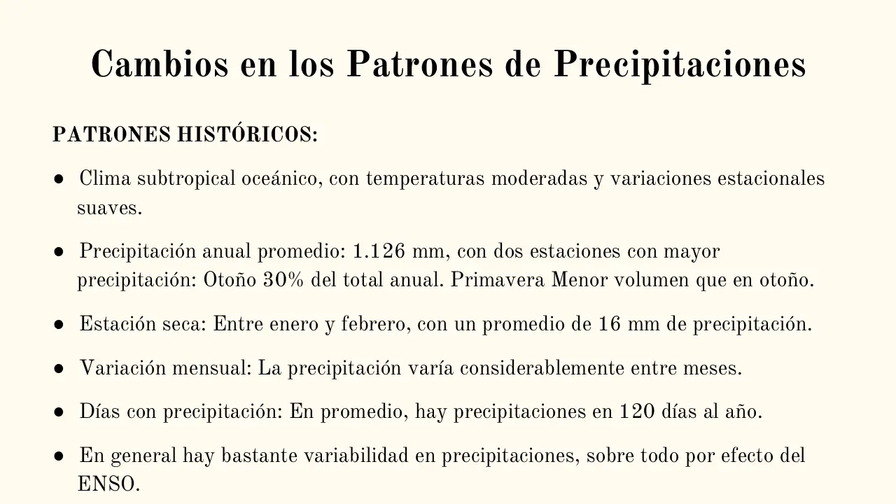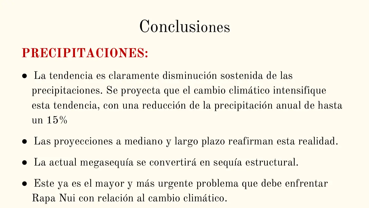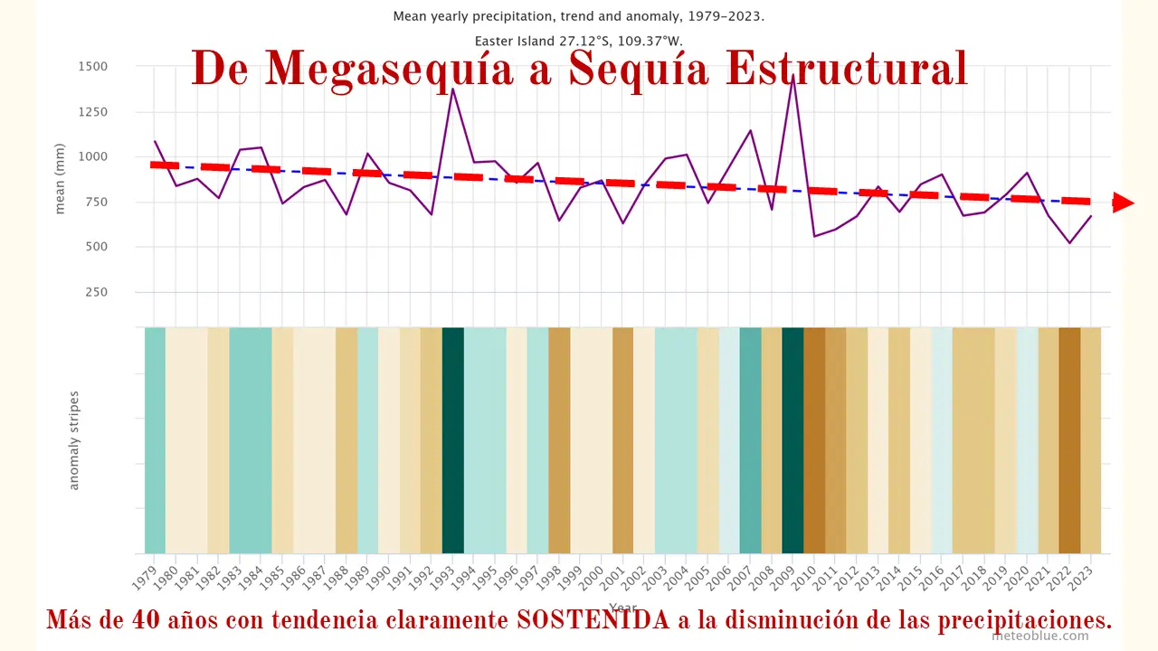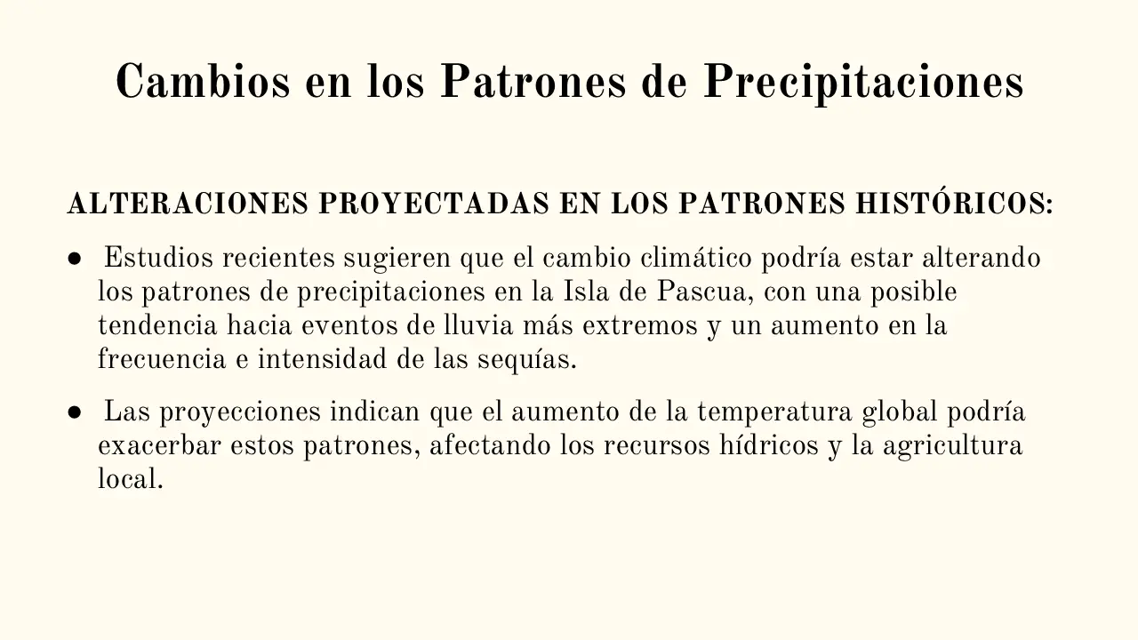 Históricamente, Rapa Nui se caracterizó por tener un clima subtropical oceánico moderado, con precipitaciones anuales de 1.126 mm. Sin embargo, el cambio climático está alterando estos patrones, haciendo que las lluvias sean más erráticas y con mayor variabilidad estacional. Se proyecta una tendencia hacia eventos más extremos, con largos periodos de sequía intercalados con lluvias intensas y breves. Esta alteración tendrá consecuencias severas en los ciclos biológicos de las plantas y en la capacidad de planificación de los agricultores, generando menores rendimientos y mayores desafíos en la gestión de los recursos hídricos.