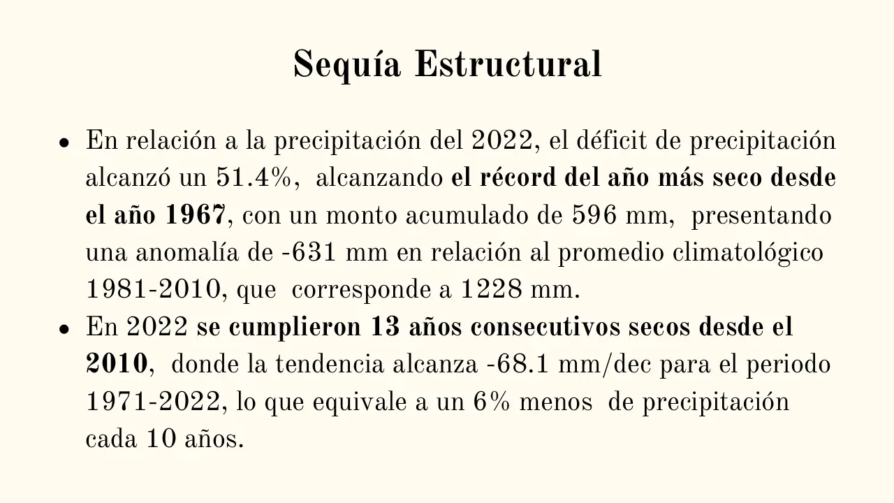 La presentación se centra en la creciente amenaza del cambio climático en Rapa Nui, una realidad innegable para la isla, cuyos efectos ya están generando un impacto significativo en su agricultura. Los datos presentados revelan que la última década ha sido la más seca en los últimos 50 años. Particularmente, el período entre 2013 y 2017 marcó un hito crítico en términos de déficit hídrico, con un promedio sostenido de años secos. Además, el año 2021 registró un déficit de precipitación del 22%, consolidando 12 años consecutivos de valores bajo la media. Este fenómeno de megasequía está en transición hacia una sequía estructural, que amenaza con ser la nueva normalidad en Rapa Nui.