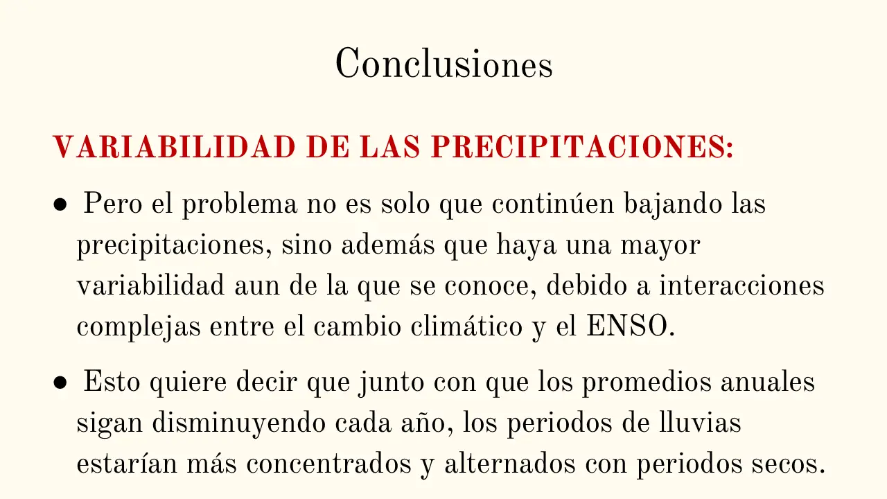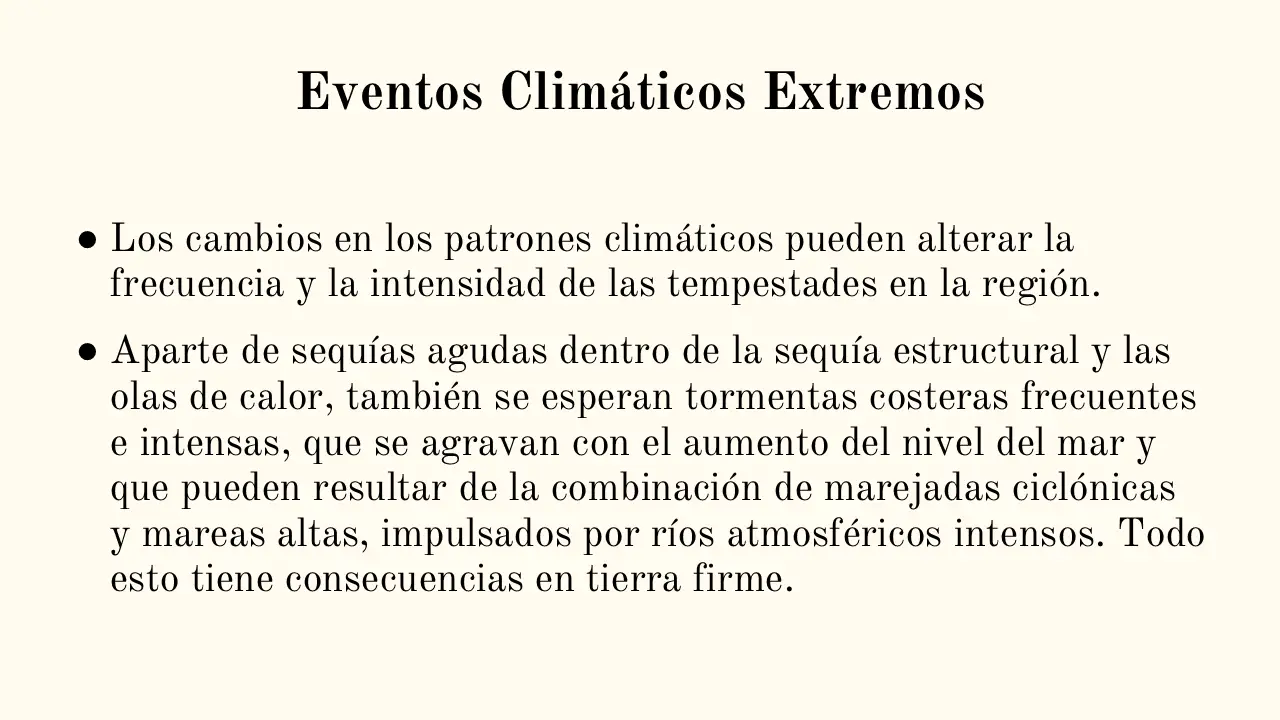 En términos agrícolas, el estrés térmico en las plantas, las alteraciones en los ciclos de crecimiento, el incremento de plagas y enfermedades son efectos directos de estas alteraciones climáticas. Asimismo, las proyecciones indican que las precipitaciones podrían reducirse hasta un 15% adicional, intensificando aún más las sequías y aumentando la incertidumbre en la gestión agrícola.