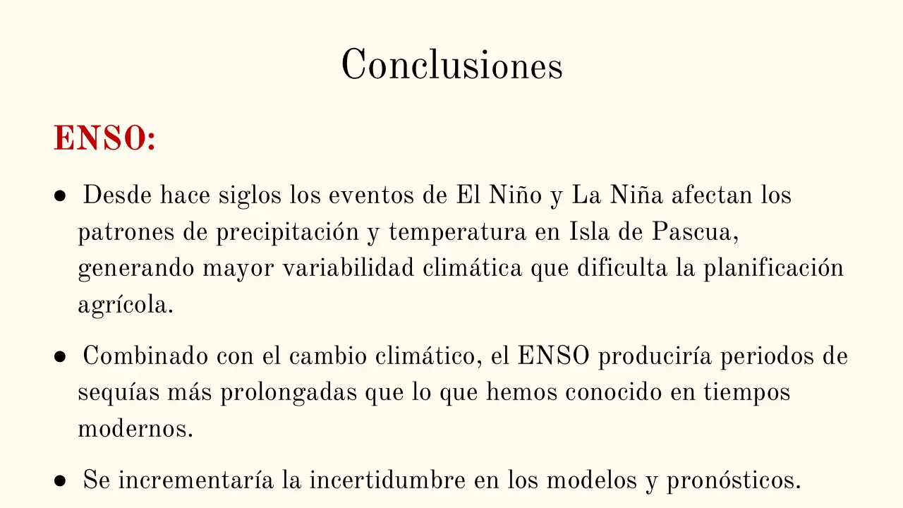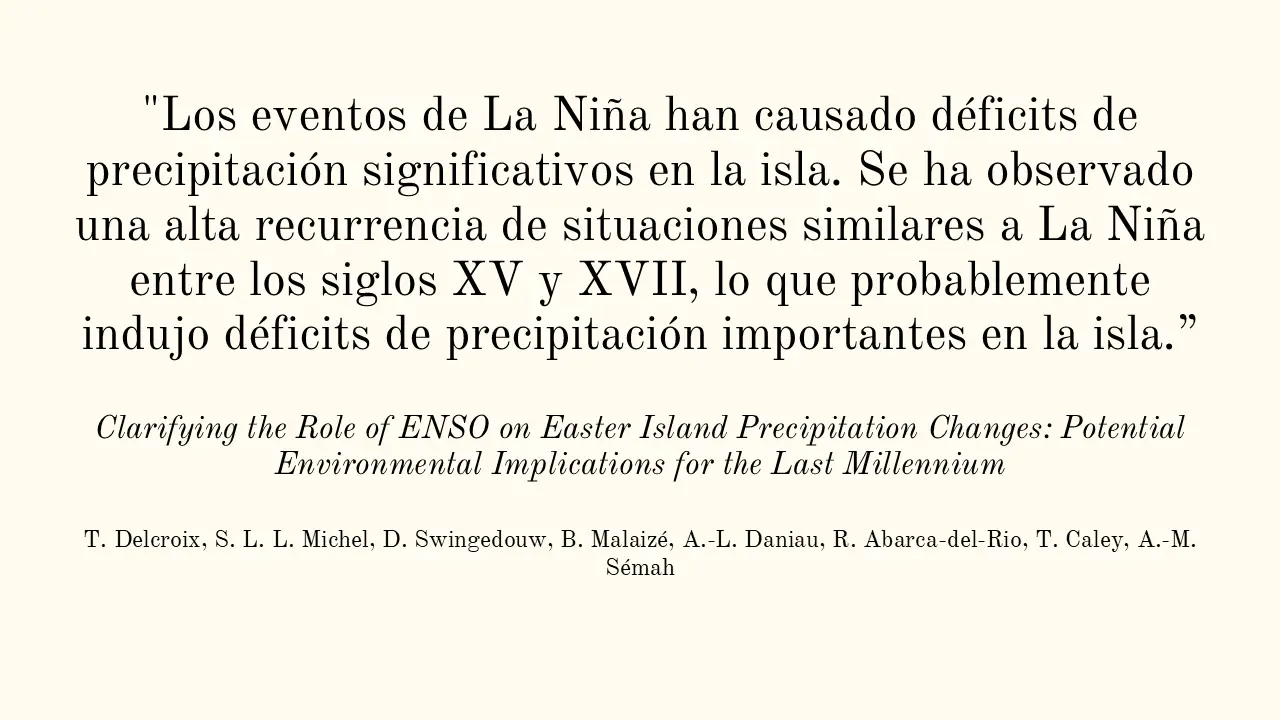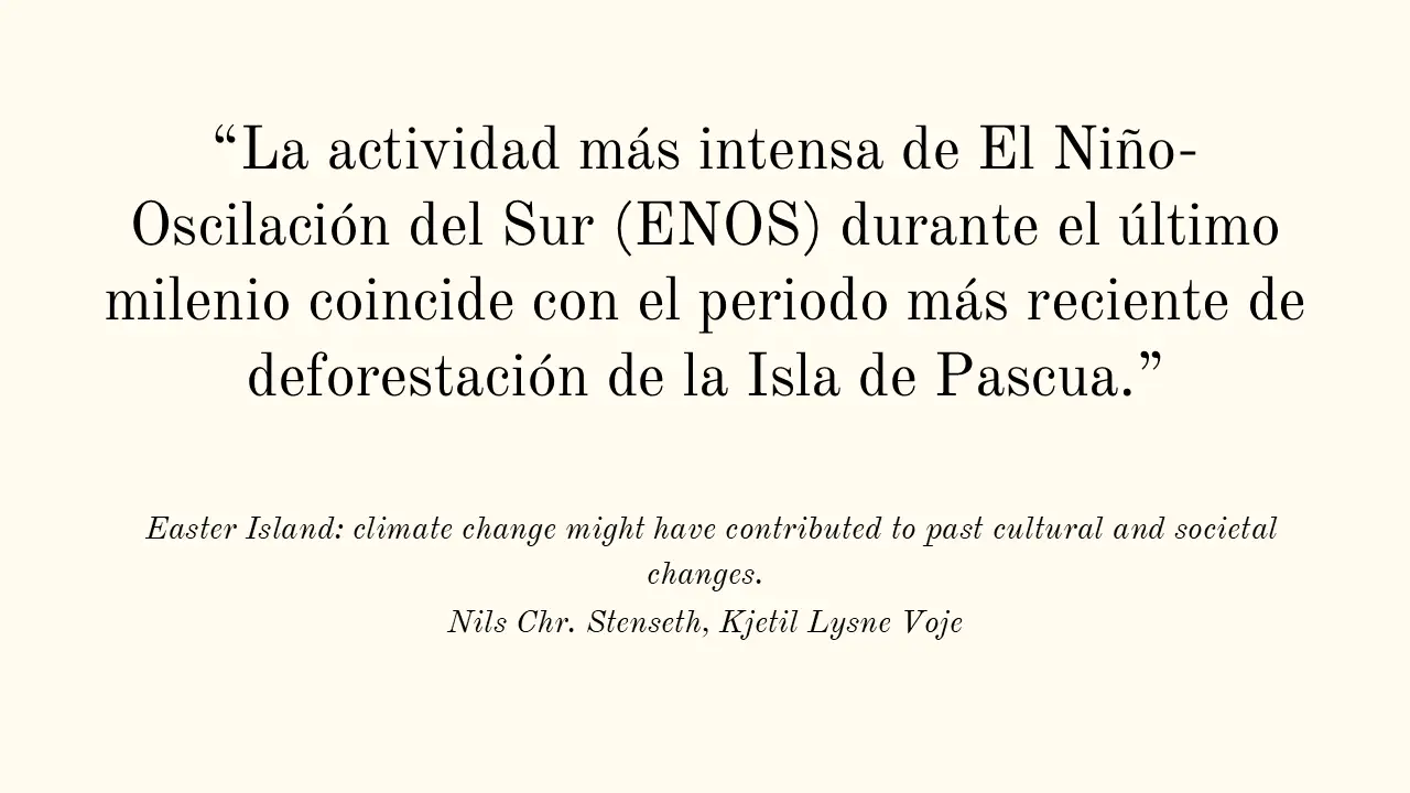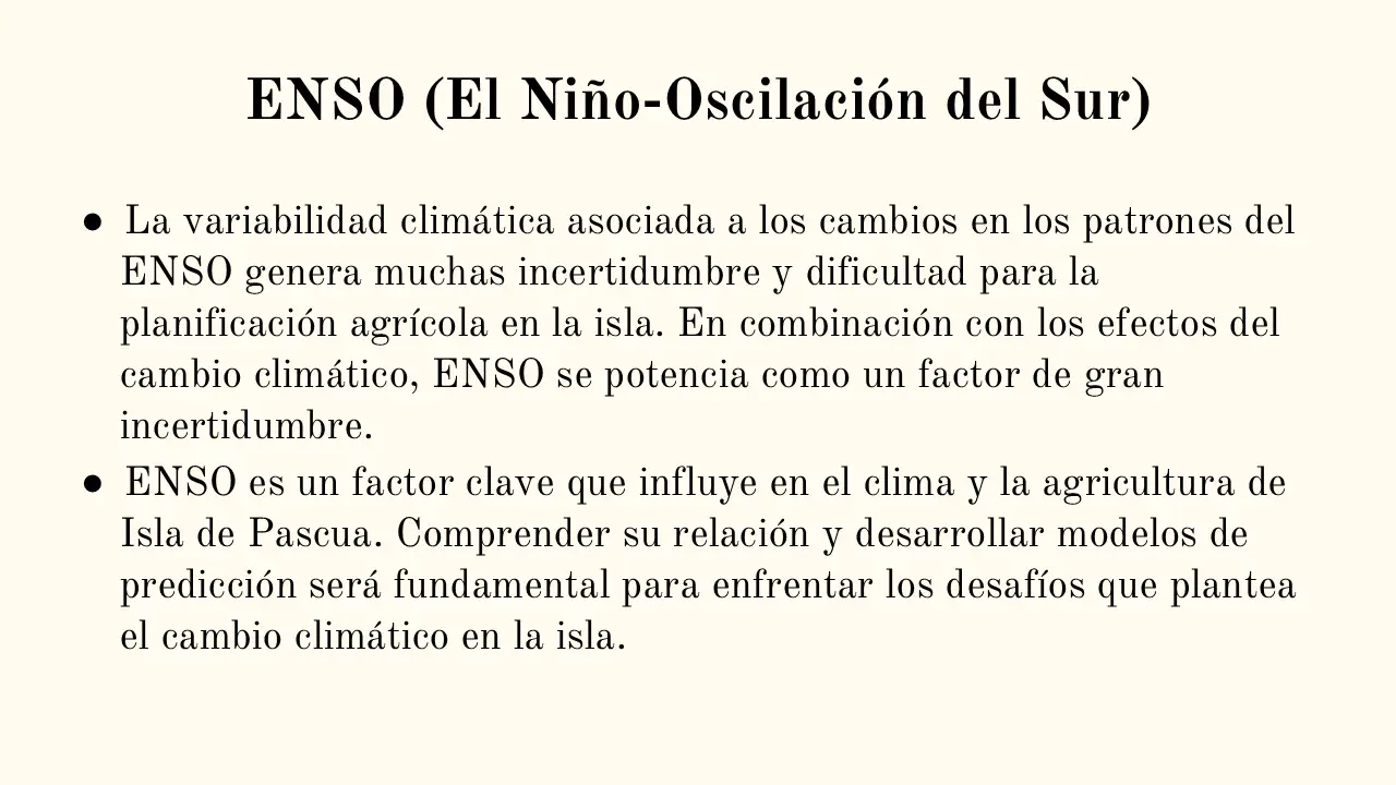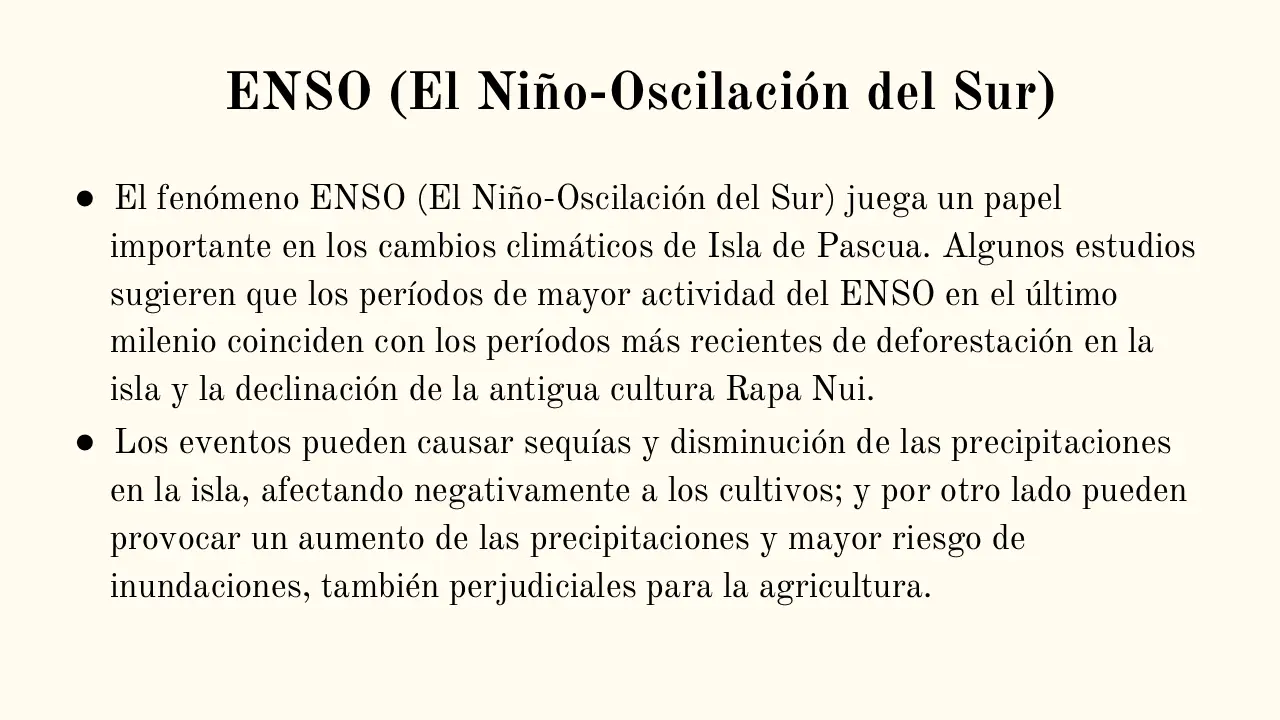 El fenómeno El Niño-Oscilación del Sur (ENSO) juega un papel determinante en la variabilidad climática de la isla, causando tanto sequías prolongadas como lluvias torrenciales. Los estudios señalan que los períodos de mayor actividad del ENSO coincidieron históricamente con momentos de deforestación masiva en la isla y declive cultural. Esto sugiere que el ENSO, en combinación con el cambio climático, podría agravar las dificultades para la agricultura, incrementando la variabilidad e incertidumbre en los patrones climáticos.