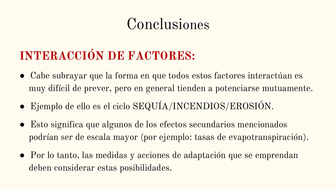 El mensaje final de la presentación es claro: la adaptación es urgente y necesaria. Las medidas de adaptación deben centrarse en mejorar la eficiencia del uso del agua, la regeneración de suelos y la diversificación de cultivos. El ciclo destructivo de sequía-incendio-erosión no solo es una amenaza a la seguridad alimentaria, sino también a la identidad cultural de la isla, lo que exige una respuesta coordinada y proactiva.