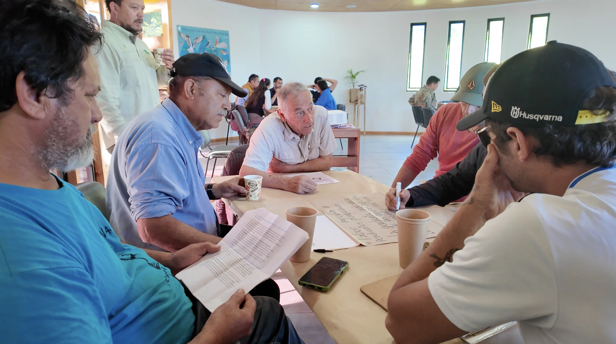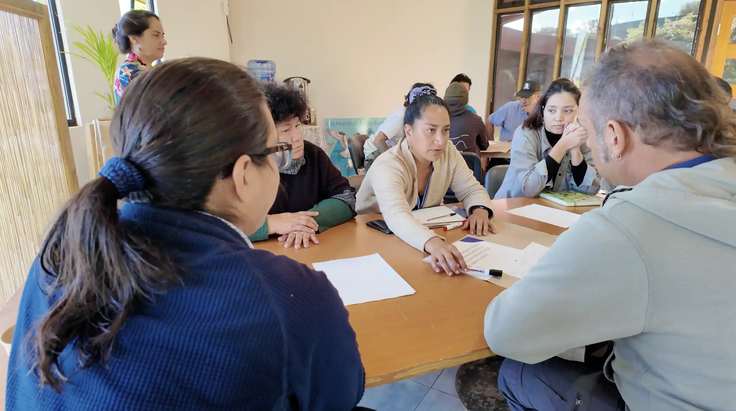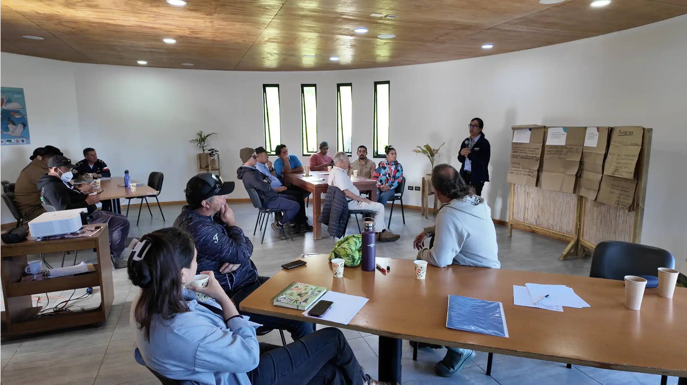La mesa sectorial utilizó la metodología de World Café, una técnica de diálogo participativo que permite a los participantes discutir temas en profundidad en un ambiente informal y colaborativo. Los asistentes se dividieron en 4 grupos pequeños, distribuidos dentro del auditorio de CONAF en Mataveri Otai, y rotaron entre diferentes mesas físicas, debatiendo sobre cada una de las 5 preguntas claves seleccionadas por el equipo para esta mesa.