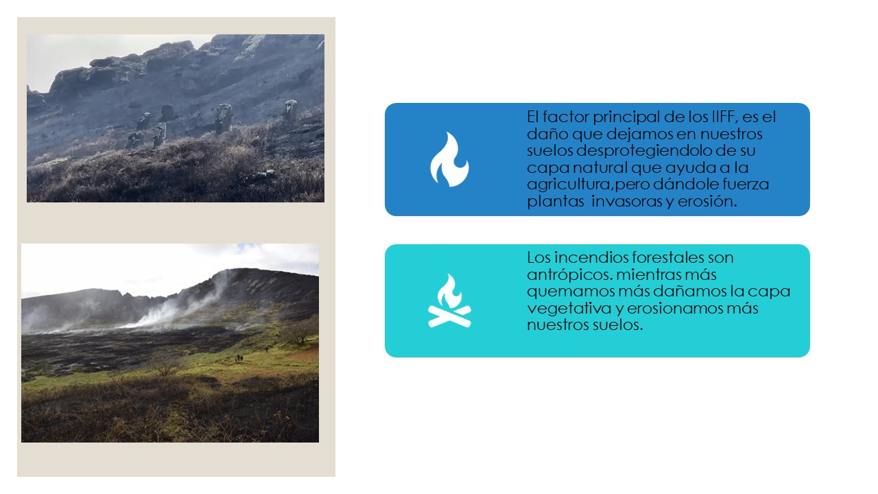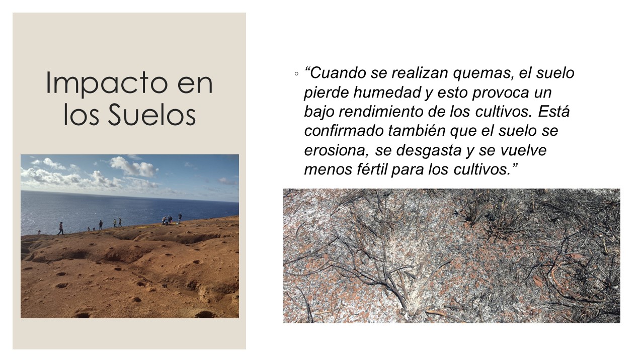 El grupo de la Mesa 3 identificó los incendios forestales como uno de los principales factores que están contribuyendo a la erosión del suelo en la isla. Según los participantes, los incendios antrópicos (causados por el ser humano) han sido una constante desde tiempos ancestrales hasta la actualidad. Estos incendios dañan la capa superior del suelo, lo que provoca una disminución de los minerales y nutrientes disponibles, afectando así la fertilidad del terreno.