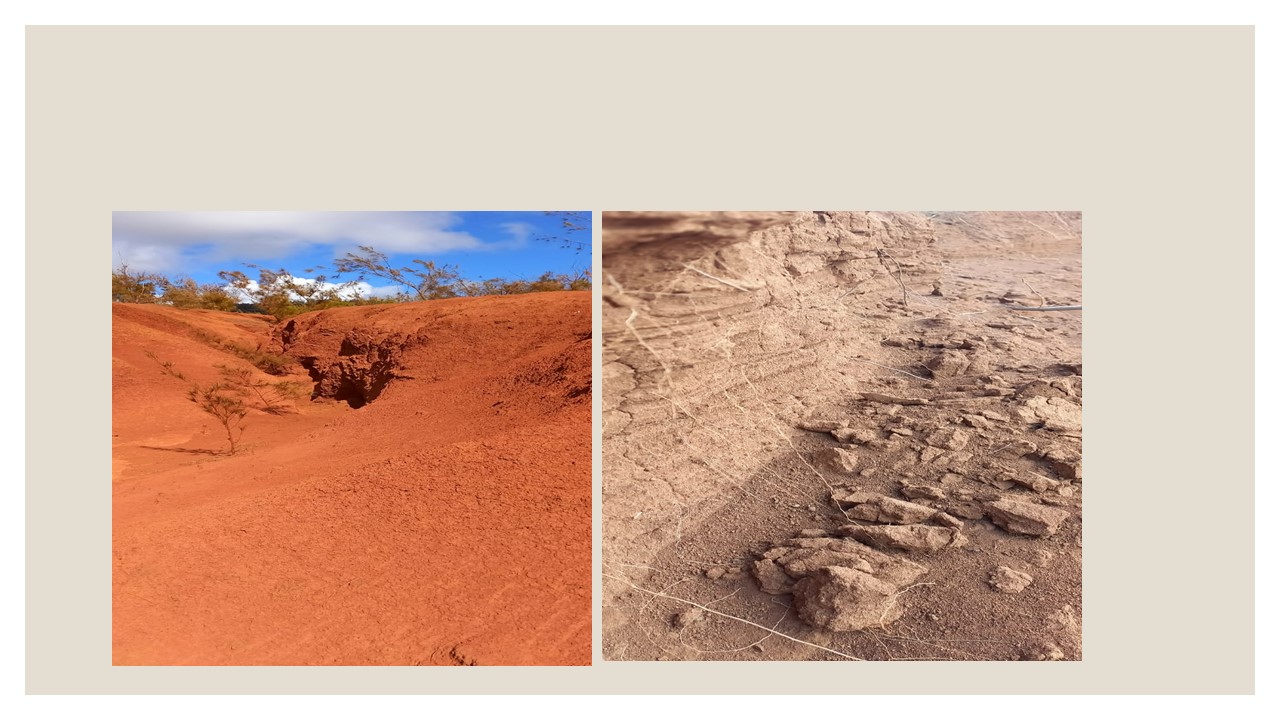 | Cárcavas y erosión en pendientes afectan gravemente las tierras agrícolas. Se han perdido zonas productivas debido al mal manejo del suelo. | Lluvias más intensas y sequías prolongadas agravan la erosión. La radiación solar excesiva impermeabiliza el suelo, afectando la microbiología. |