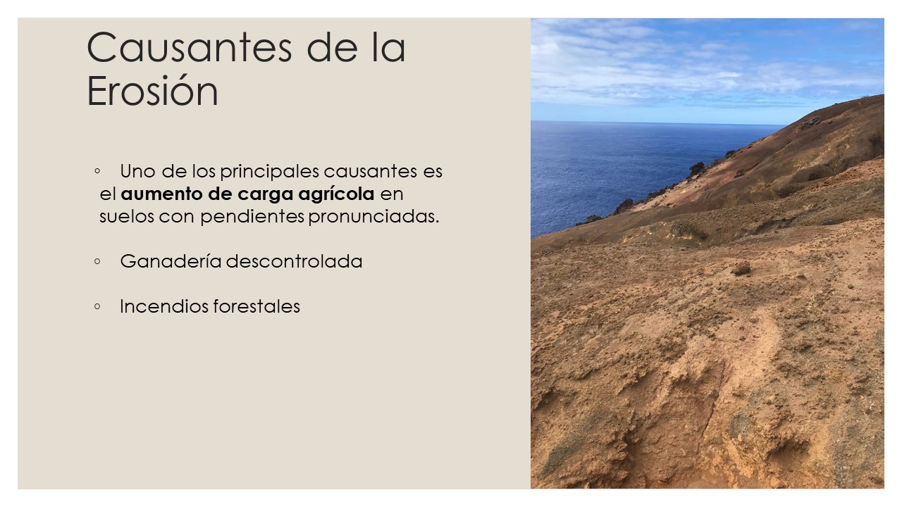 Además, el cambio climático también ha traído periodos de sequía más prolongados, aparte de la sequía estructural que sufre la isla. Cuando el suelo está muy seco, se vuelve más frágil y vulnerable a ser erosionado cuando finalmente llegan las lluvias. También los cambios en los vientos han afectado. Vientos más fuertes pueden levantar y llevarse la capa superior del suelo, especialmente en áreas sin suficiente vegetación y sobre todo después de los efectos del fuego.