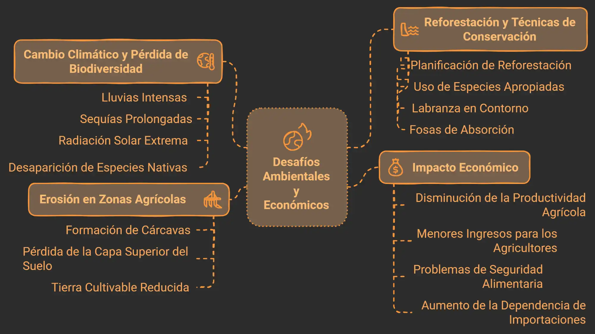 | Reducción de la capa vegetal y pérdida de suelos fértiles. La productividad agrícola disminuye, lo que afecta los ingresos de los agricultores y genera dependencia de alimentos importados. |