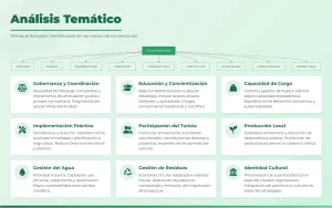 El análisis reveló un panorama complejo pero potencialmente fértil. La diversidad de perspectivas es una riqueza. Hay un consenso fundamental en la necesidad de avanzar hacia un modelo que contribuya activamente a la regeneración ecosistémica, cultural, social y económica. La fragilidad del territorio y la riqueza cultural son ejes centrales. La gobernanza compartida, educación integral, participación activa del turista e integración de conocimientos tradicionales y modernos son ejes transversales.