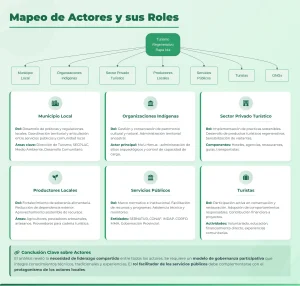 - Acción inmediata diversificada: Implementación inmediata, participación turista activa, nuevas actividades, formalización progresiva, apoyo a iniciativas existentes (refleja Mesa Celeste y Rosa).
