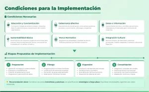 - Implementación ecosistémica: Realizar estudio de capacidad de carga, desarrollar plan de gestión hídrica, implementar programa de restauración ecosistémica nativa, establecer sistema integral de gestión de residuos (economía circular), desarrollar plan de adaptación climática insular, implementar sistemas de energía renovable, fomentar prácticas regenerativas en actividades productivas locales.