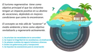 En cuanto a cómo podemos aplicar el turismo regenerativo, ya hay lugares donde podemos educarnos. Hay diseños y alternativas en Argentina, Ecuador, Chile Travel, e incluso en Oceanía. Y en Oceanía hay un ejemplo interesante: antes de entrar a algunos destinos, los turistas firman un compromiso a cuidar, resguardar, reciclar, etc.. ¡Esto es lo que queremos lograr aquí!.