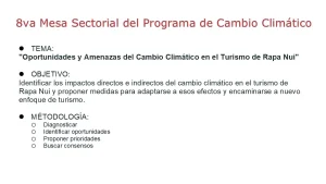 Este análisis se fundamenta en las transcripciones de siete mesas de trabajo (Beige, Amarilla, Blanca, Celeste, Roja, Rosa y Verde) que abordaron el turismo regenerativo como una estrategia de adaptación climática en Rapa Nui. El evento parece ser una continuación de una «octava mesa sectorial» previa, cuyos resultados fueron evaluados por los participantes, aunque el grado de conocimiento sobre estos resultados varió.