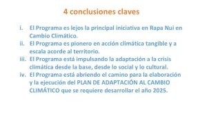 El llamado final, y por eso la importancia de que estén aquí y se queden en las mesas de trabajo, es que con todo este contexto, con estos datos y estas ideas, podamos crear los primeros lineamientos para el plan de adaptación de Rapa Nui. ¡Su apoyo en este trabajo es muy importante!.